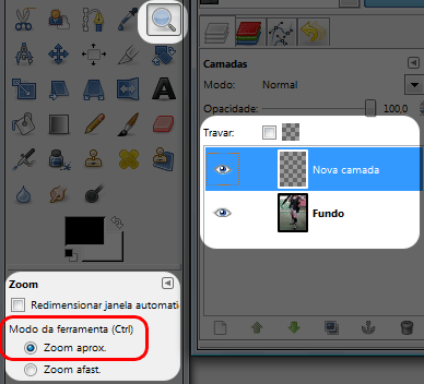Selecione a nova camada. Utilize a ferramenta Zoom e aplie a imagem (ainda com a nova camada selecionada).